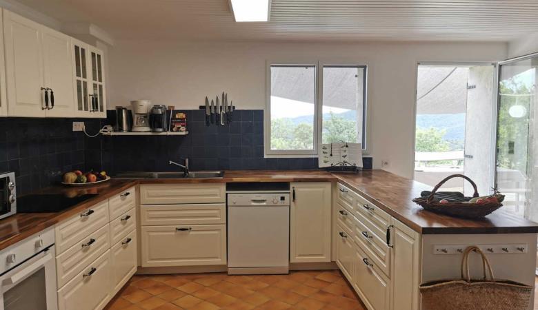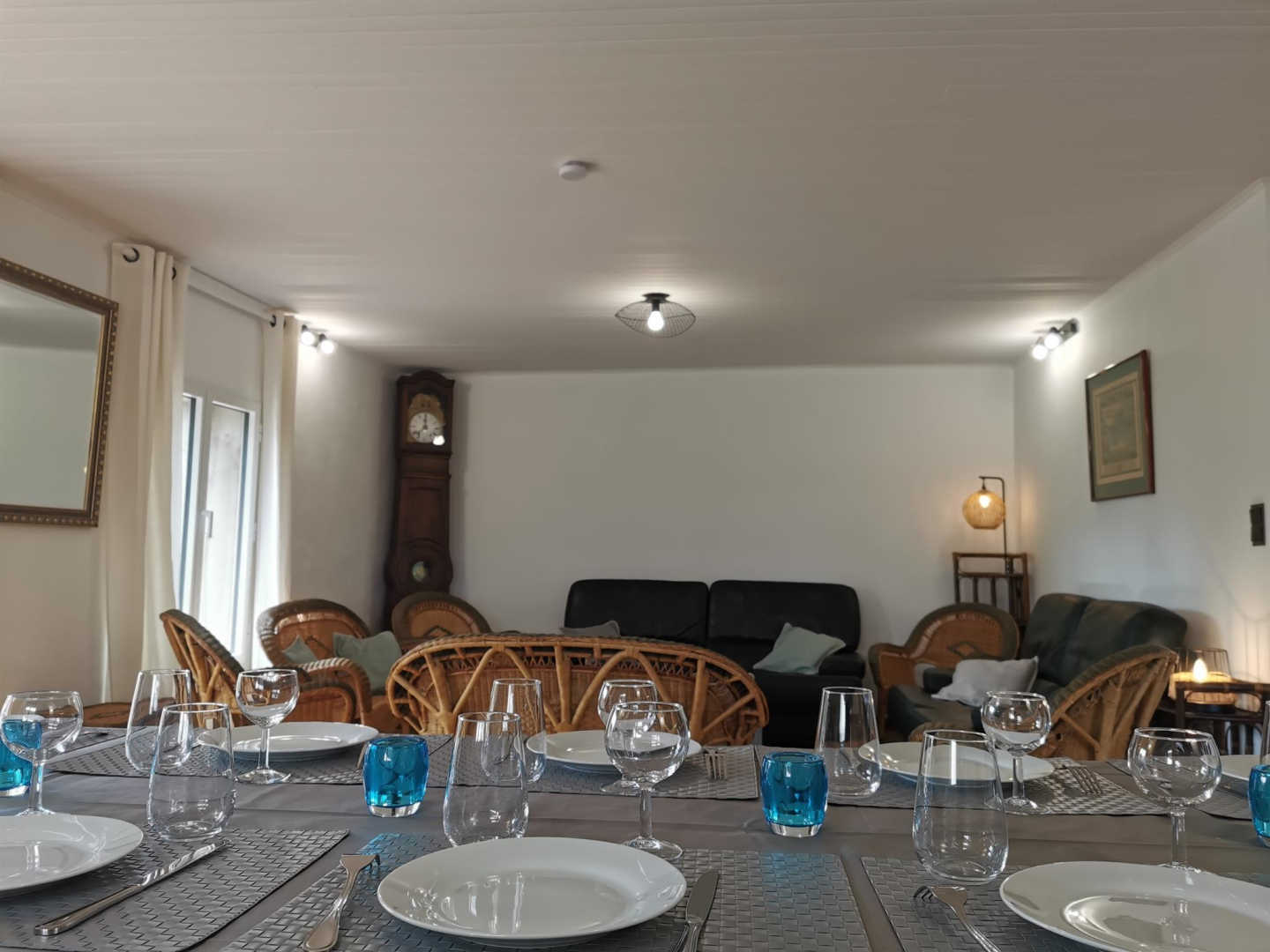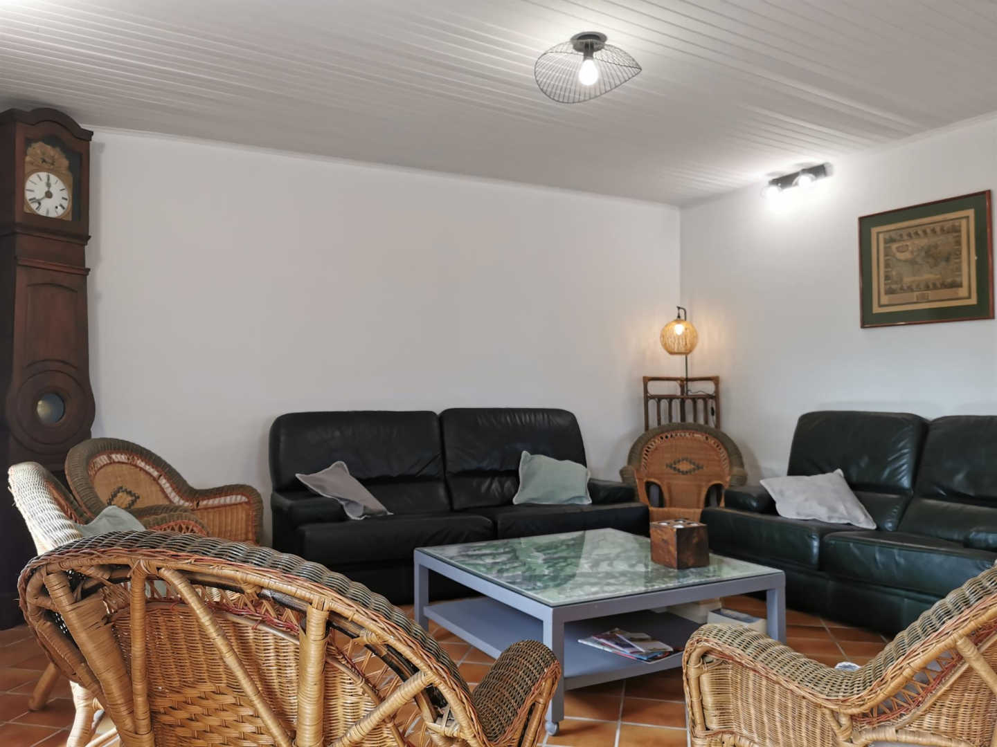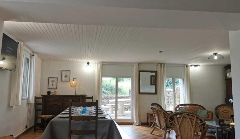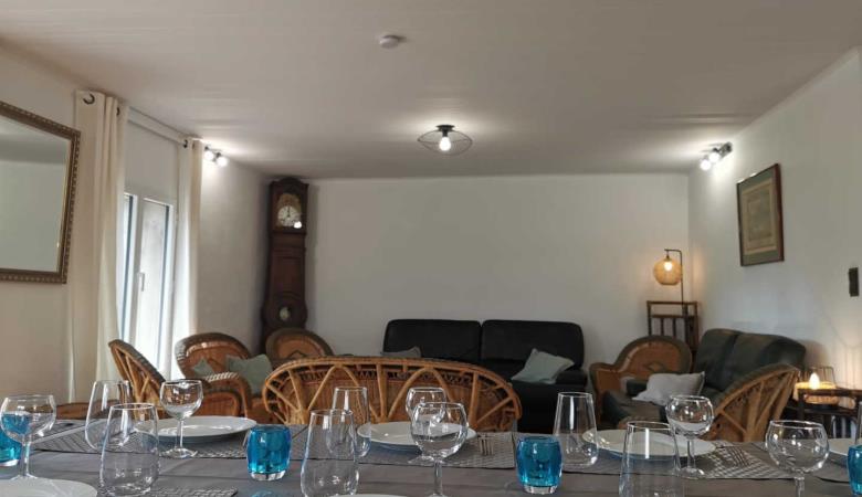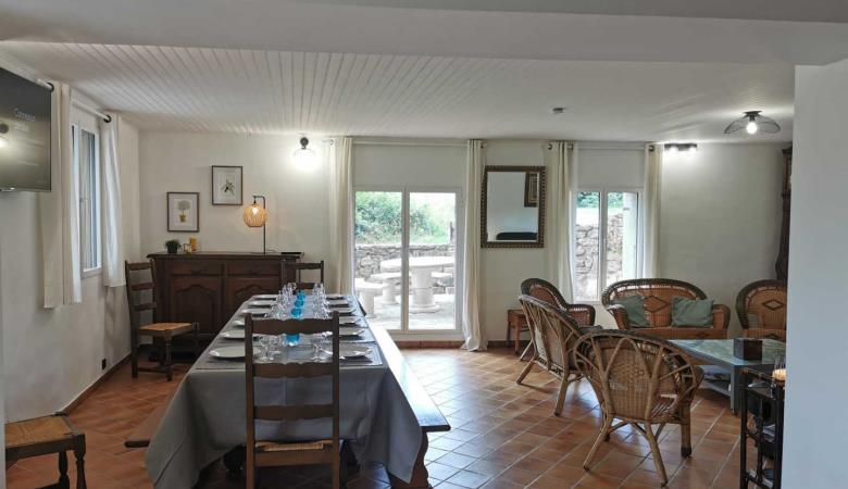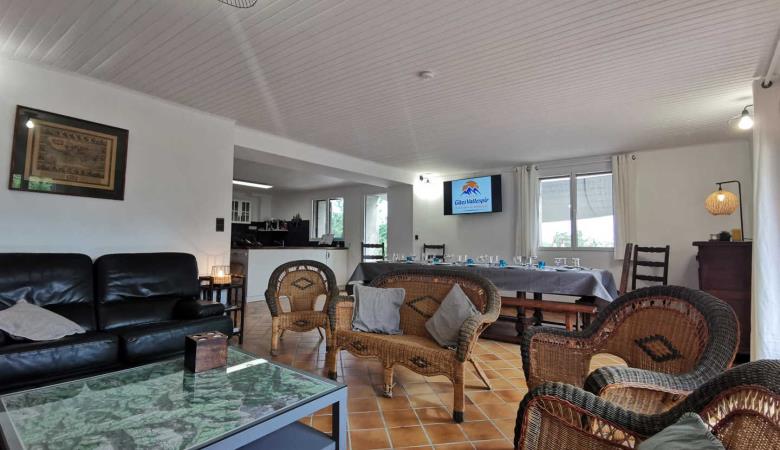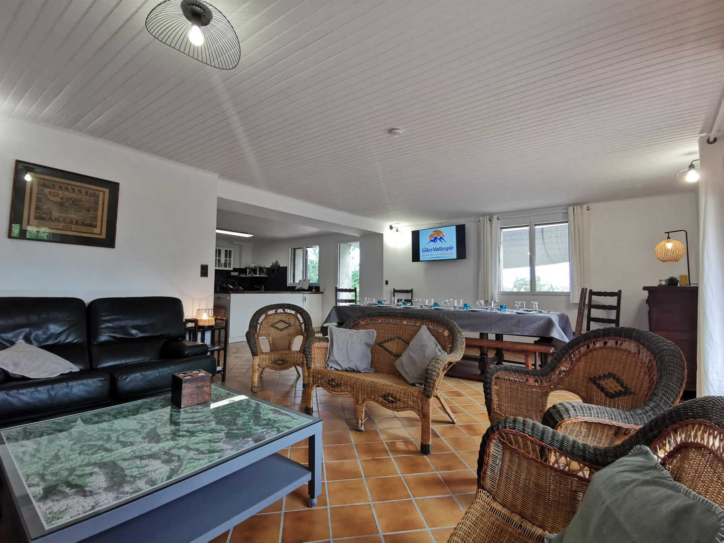 Large living room, TV, fitted kitchen opening onto the gîte's private terrace.
