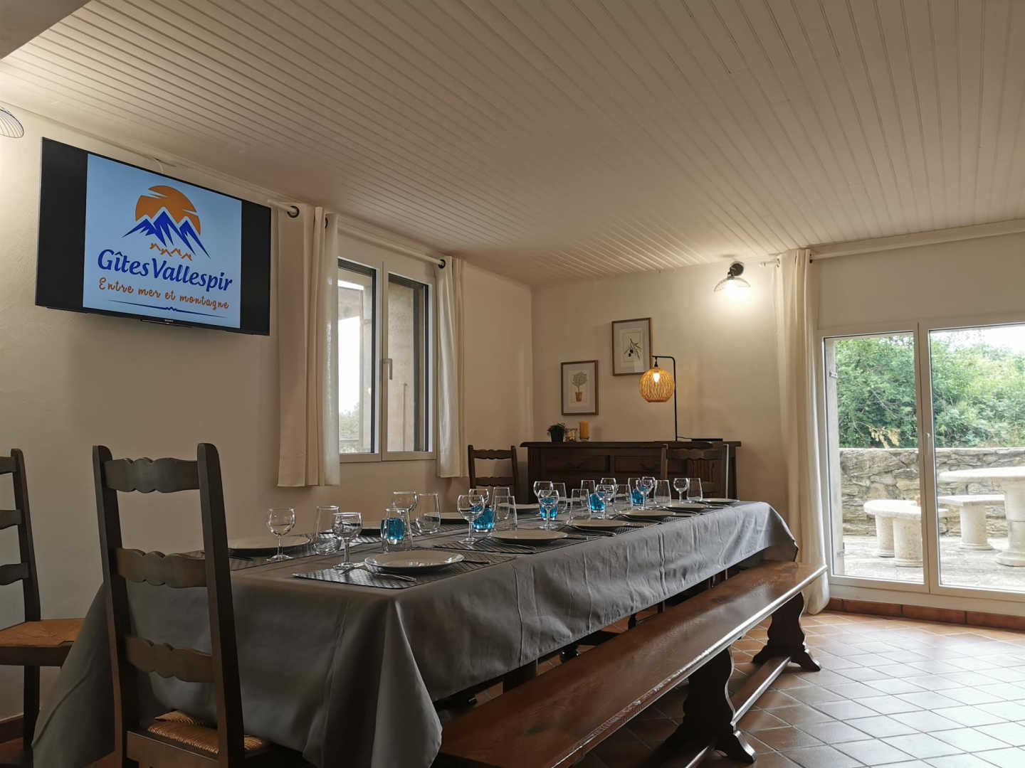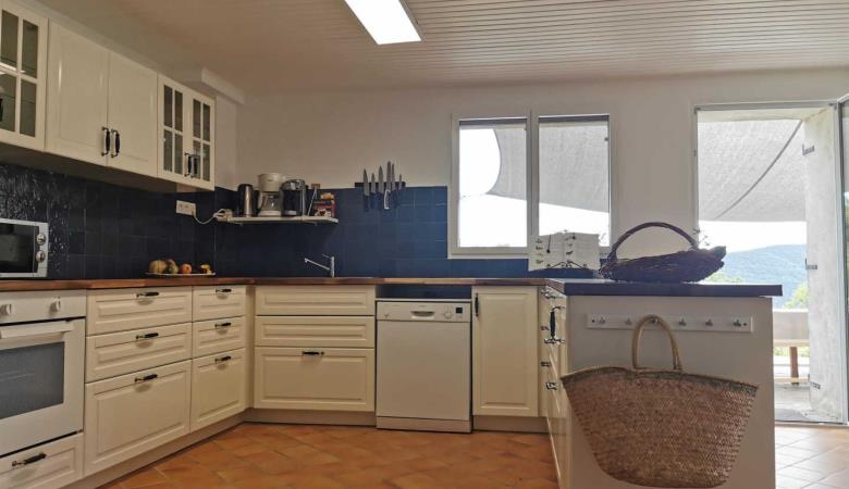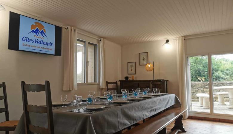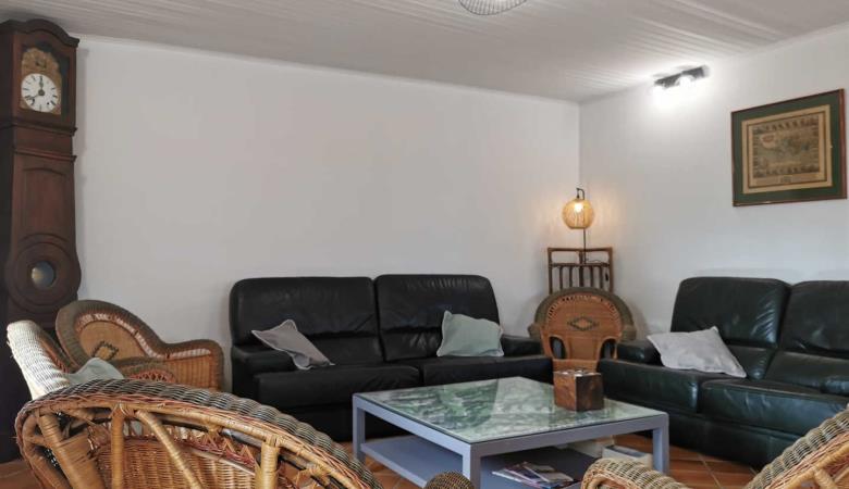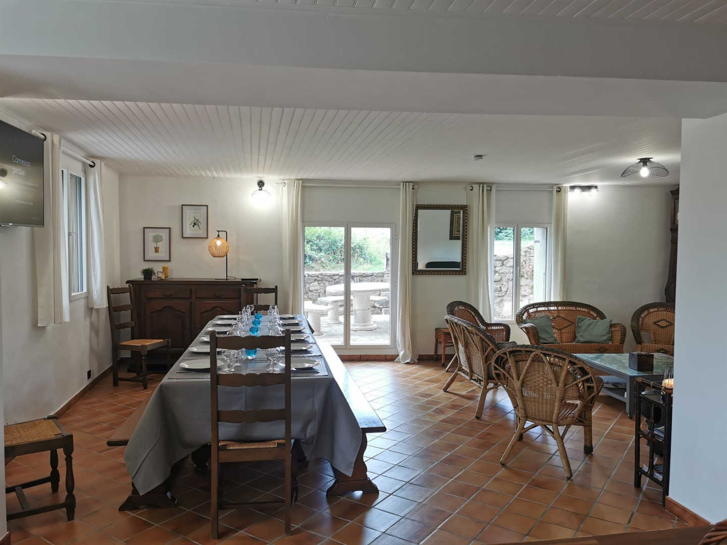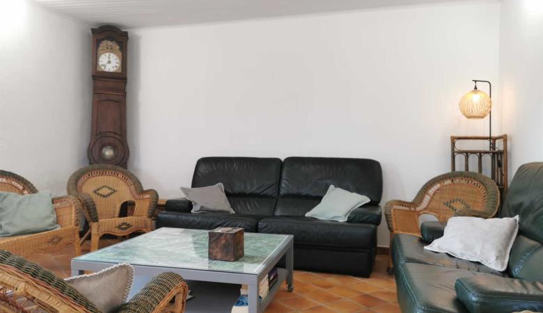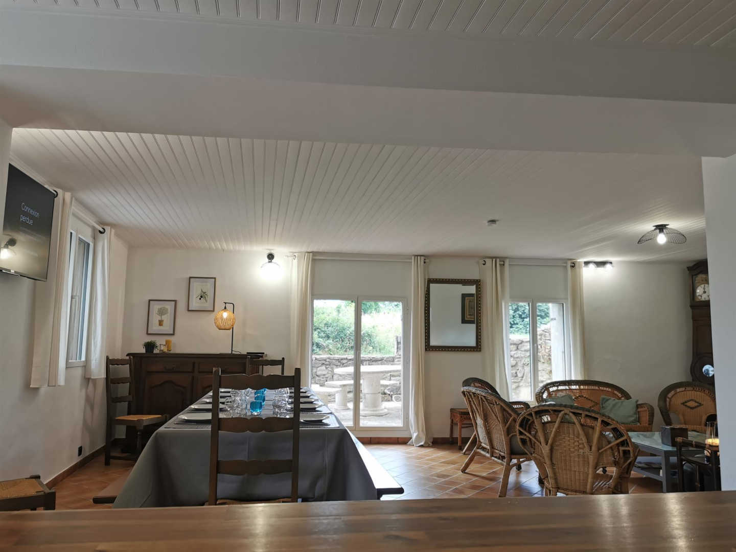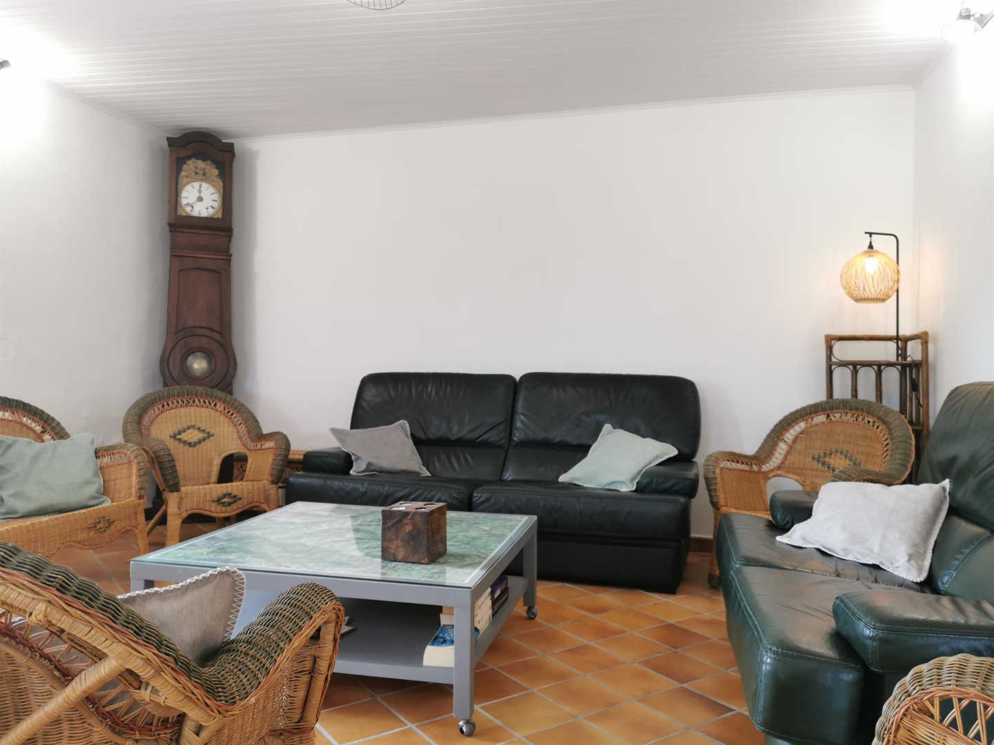 Large living room, TV, fitted kitchen opening onto the gîte's private terrace.