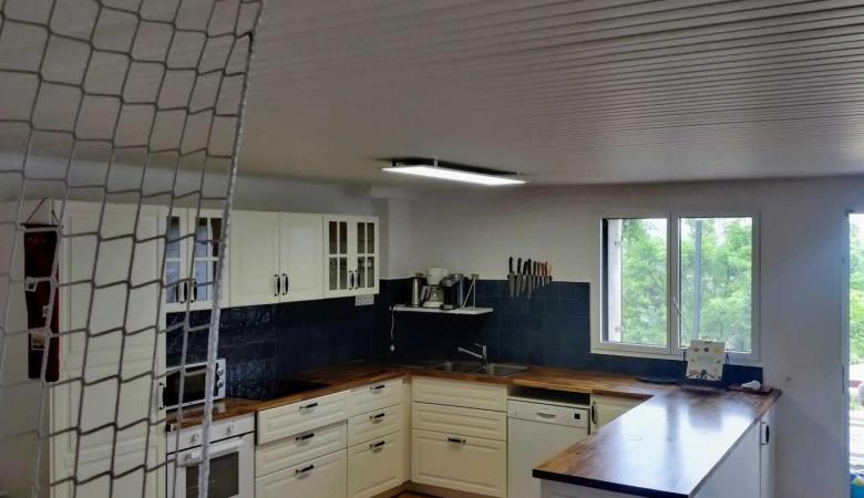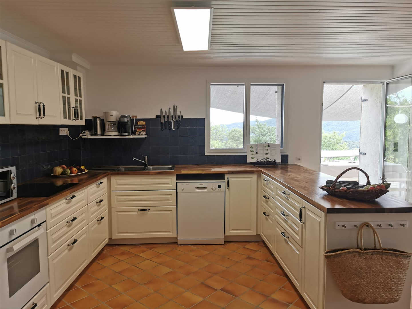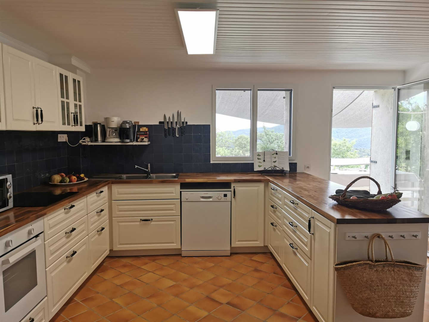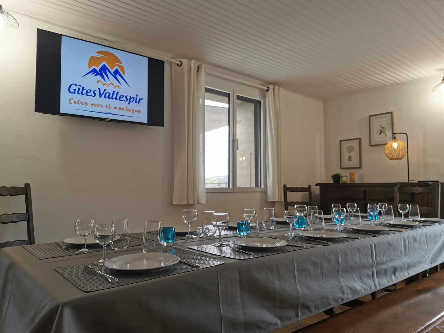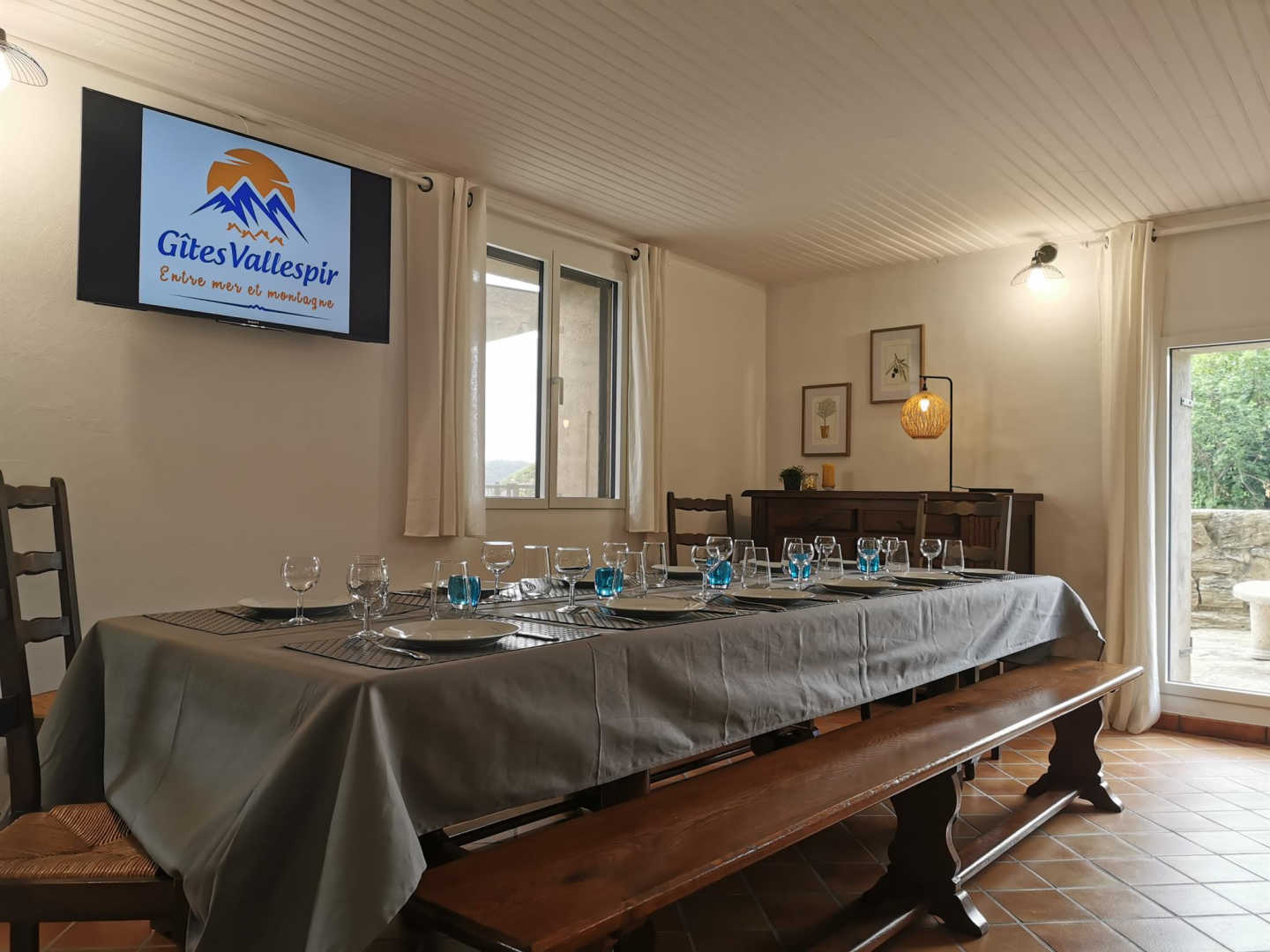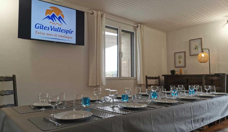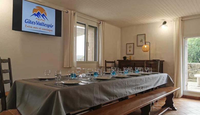 Large living room, TV, fitted kitchen opening onto the gîte's private terrace.