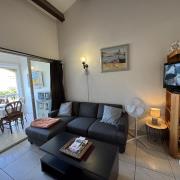 Kitchen: pod coffee maker, combined microwave oven, dishwasher, with day room: television, hi-fi bluetooth, sofa, a fold-away 160 bed, opening onto balcony with garden furniture, and lovely views over the pine forest, which leads to the beaches.