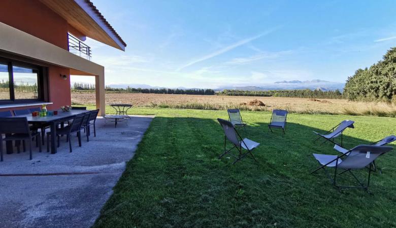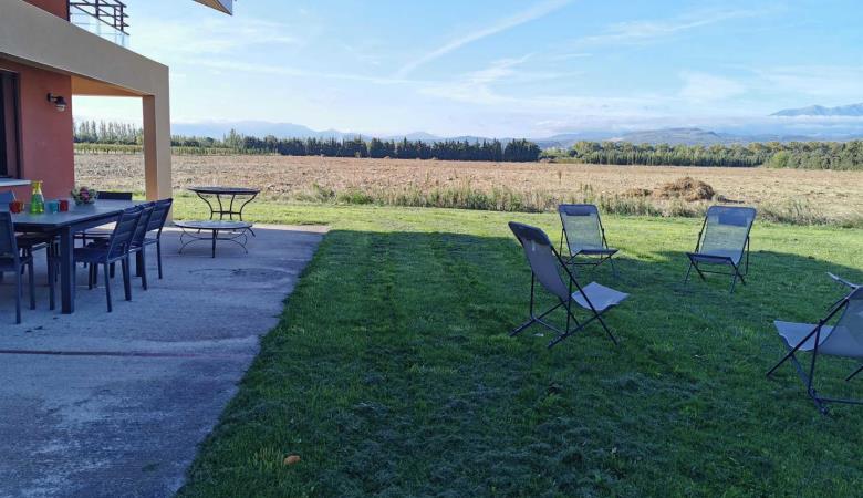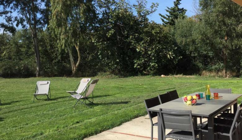 Large unfenced garden with flowers, garden furniture and barbecue.