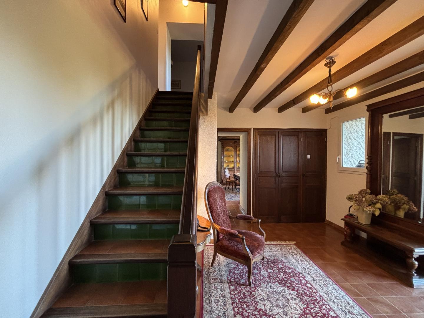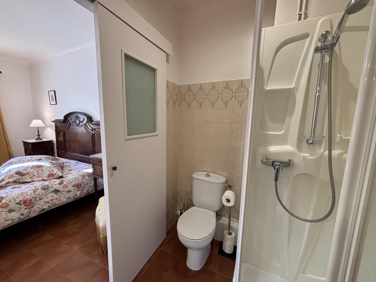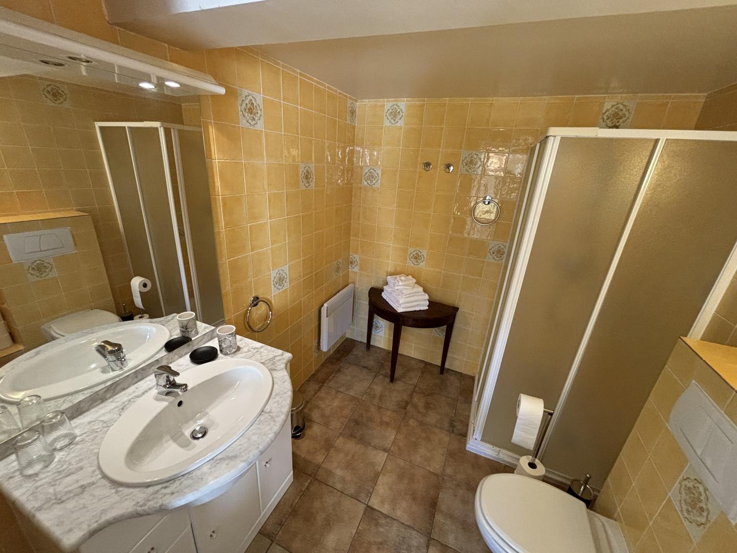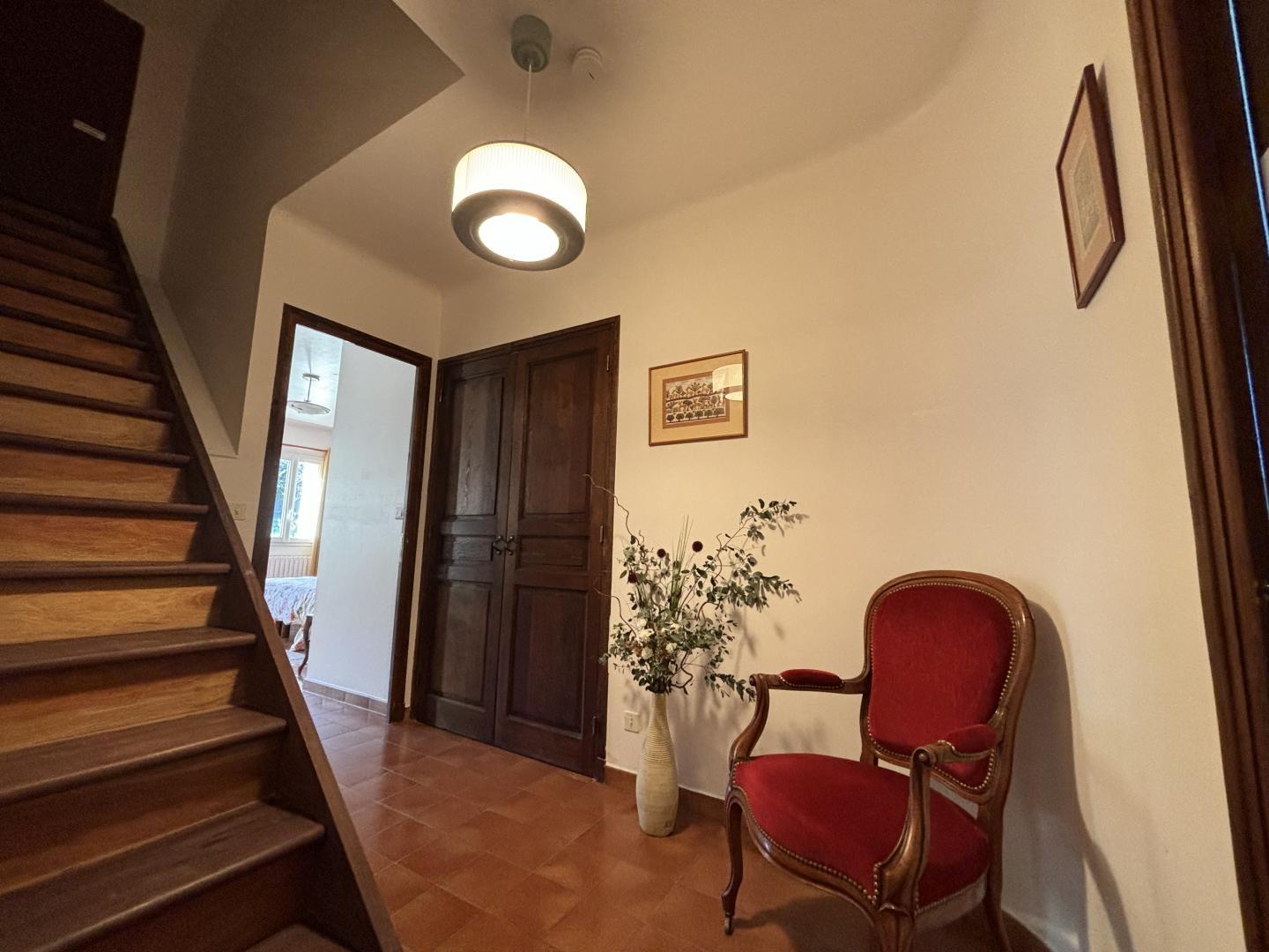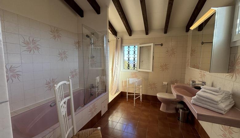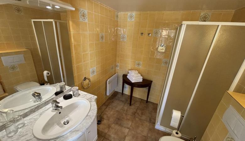 From the entrance hall, a staircase leads to the upper floor, which comprises 3 bedrooms: each has a shower room with bath or shower and sanitary facilities, a study and storage space.