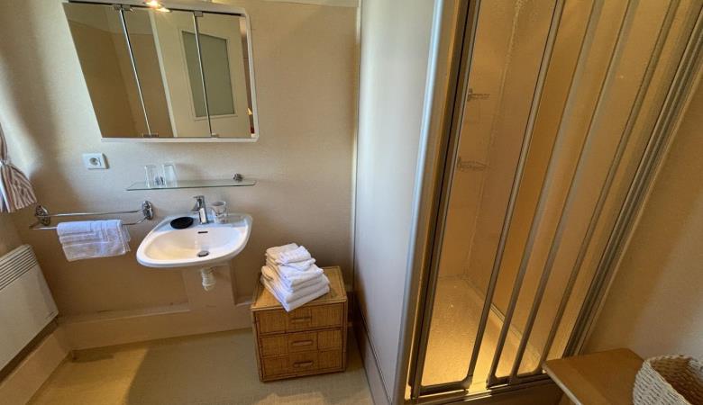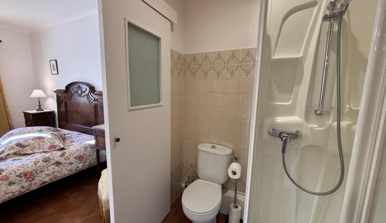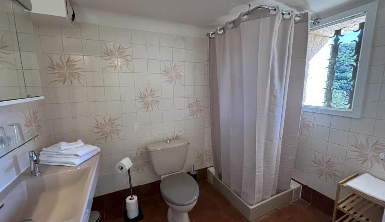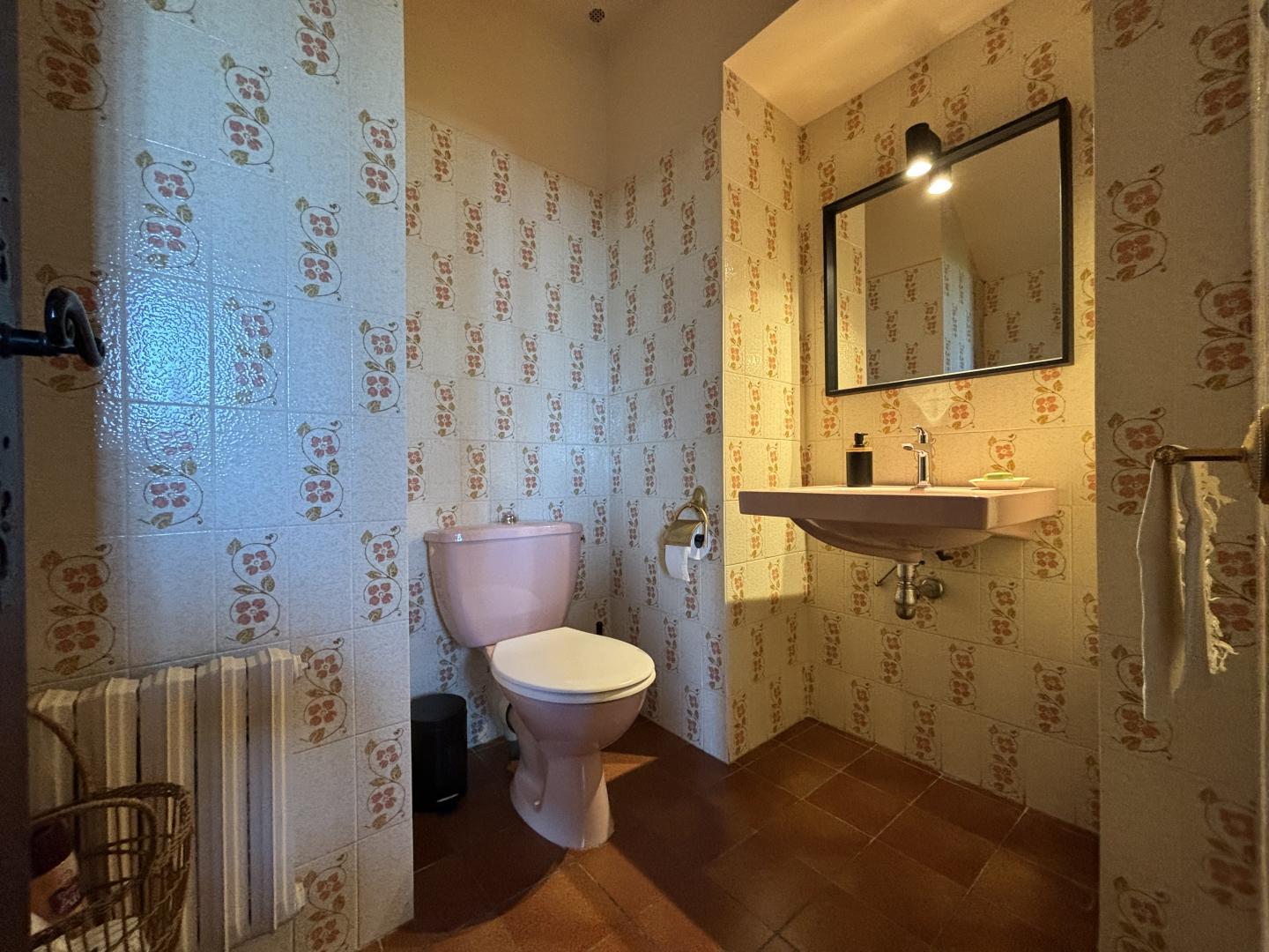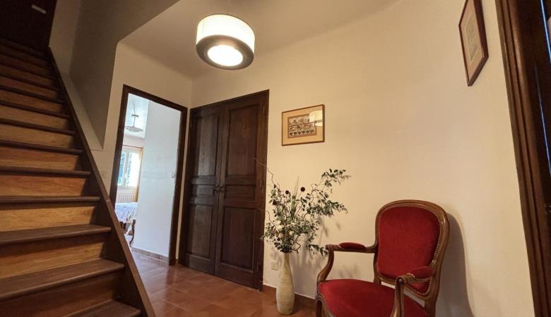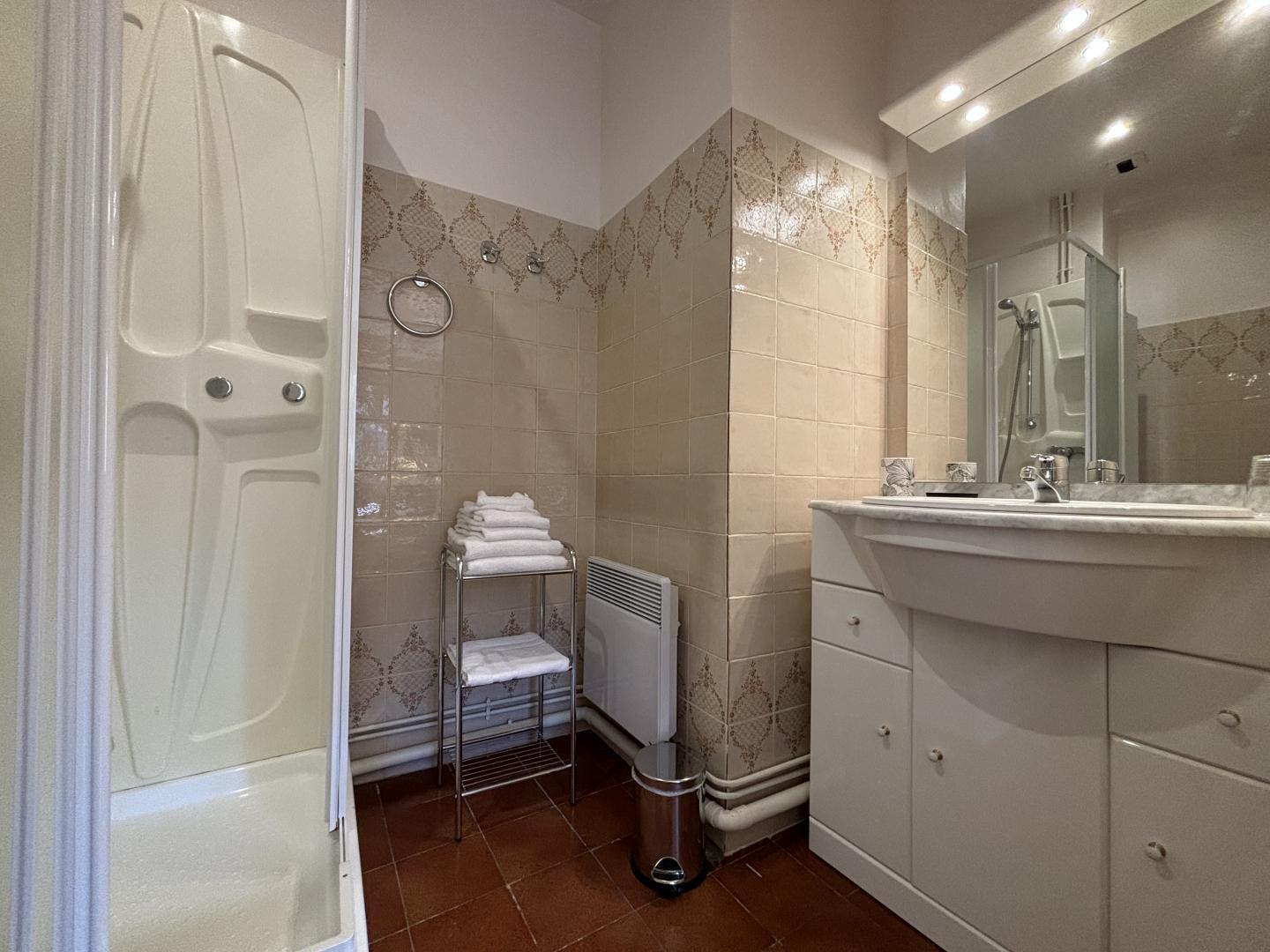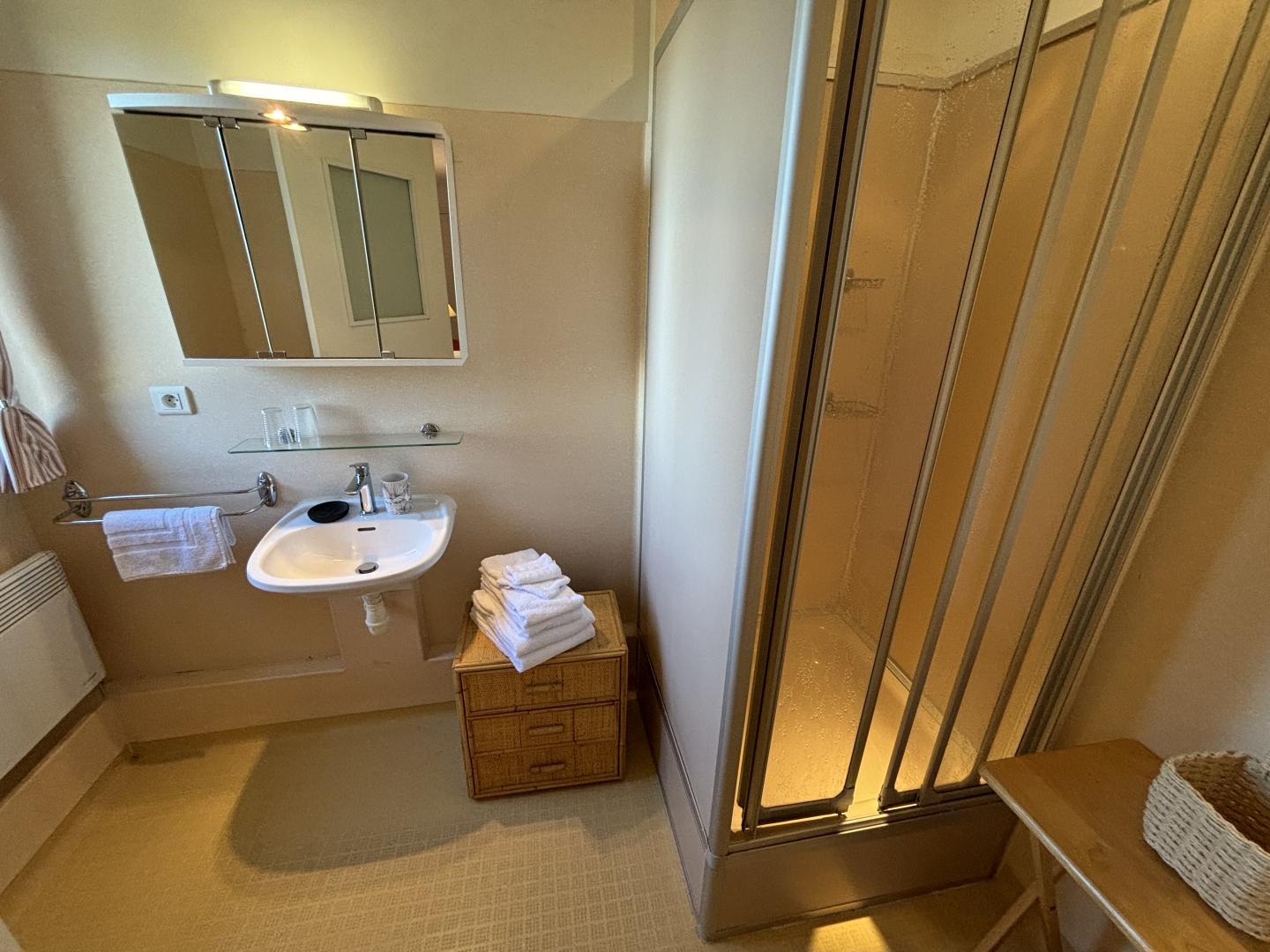 From the entrance hall, a staircase leads to the upper floor, which comprises 3 bedrooms: each has a shower room with bath or shower and sanitary facilities, a study and storage space.
