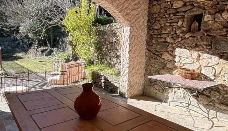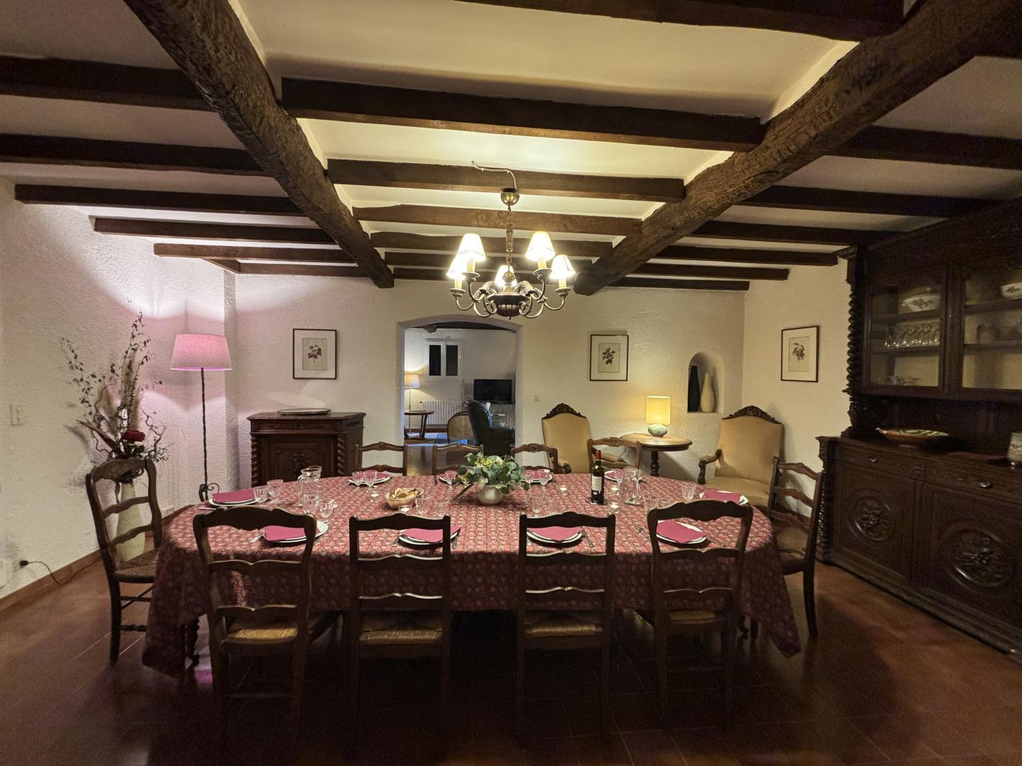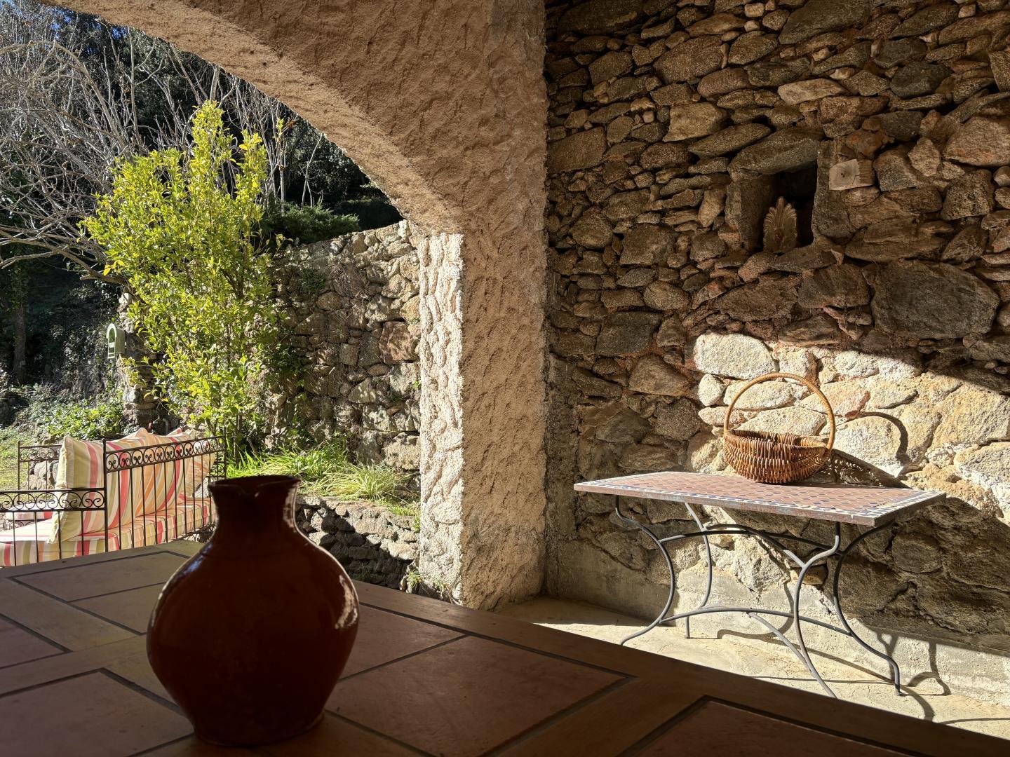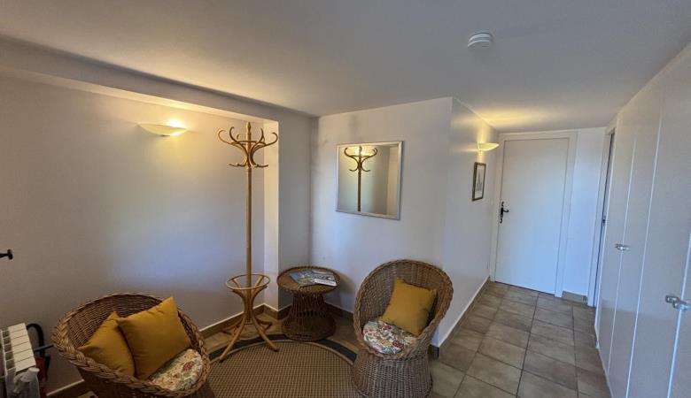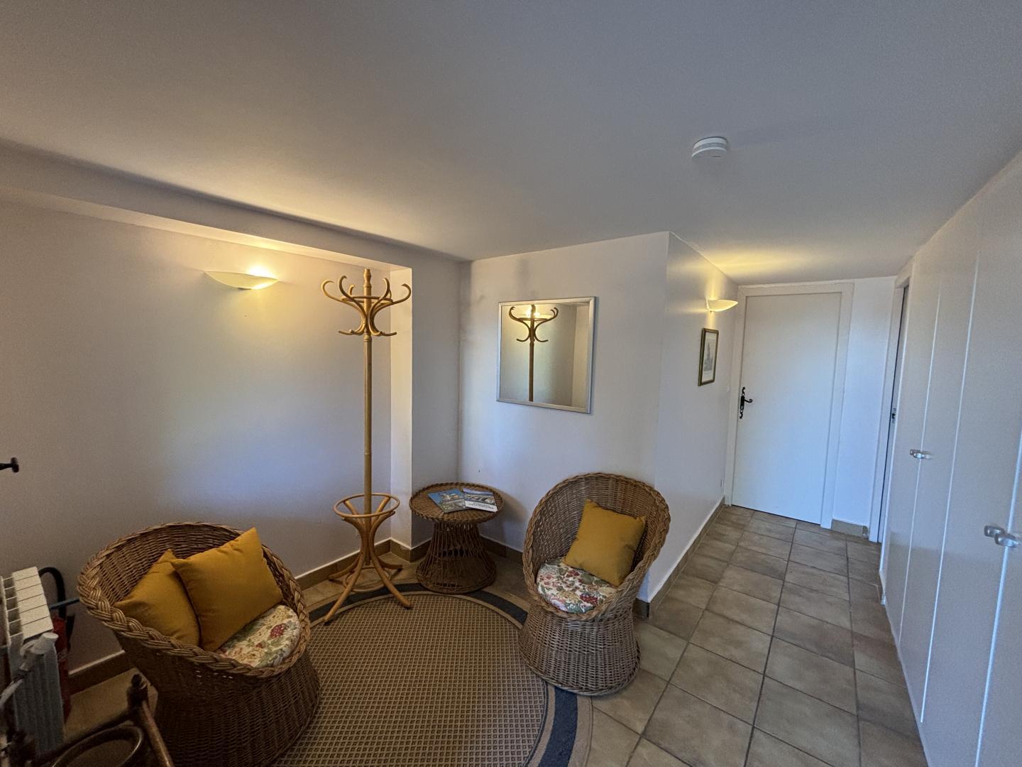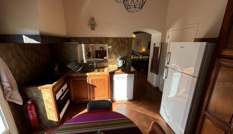 A large lounge with fireplace and television, a dining room, a kitchen with access via an outside staircase leading to another terrace with alcove, equipped with a table and garden furniture.