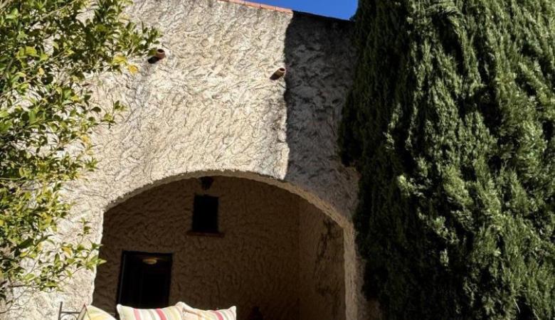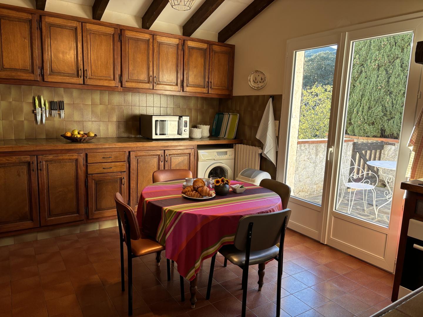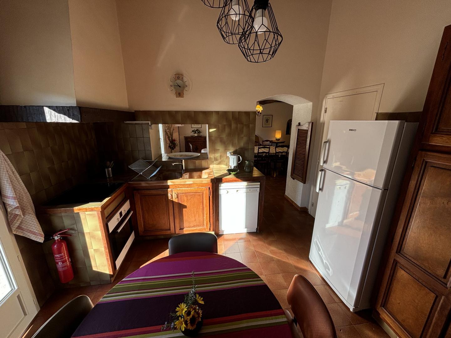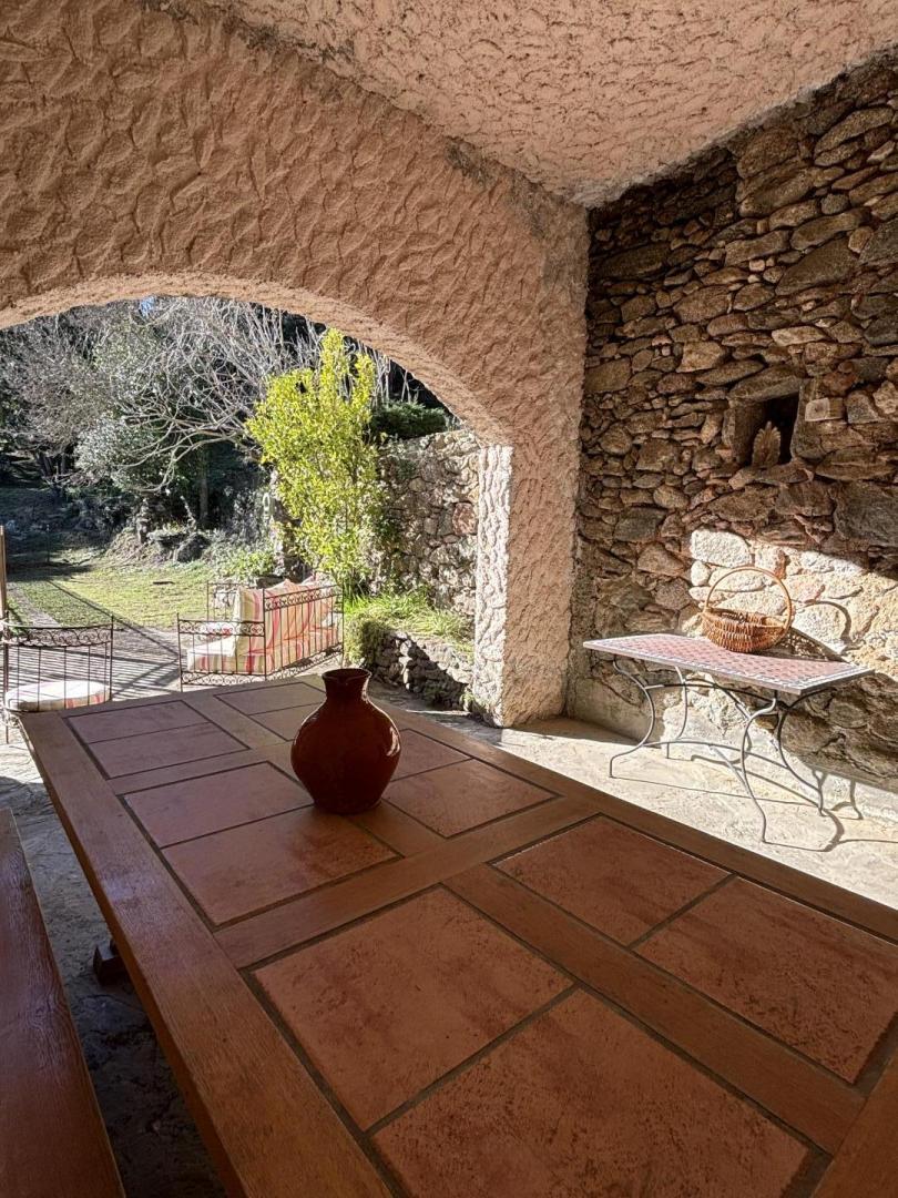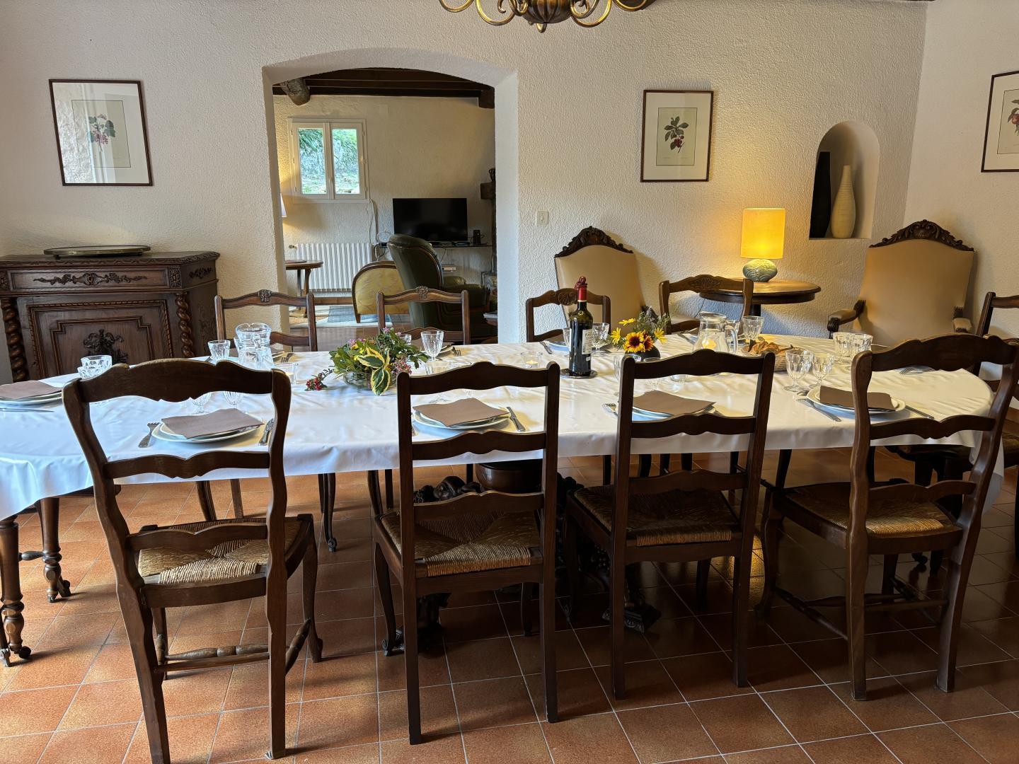 A large lounge with fireplace and television, a dining room, a kitchen with access via an outside staircase leading to another terrace with alcove, equipped with a table and garden furniture.