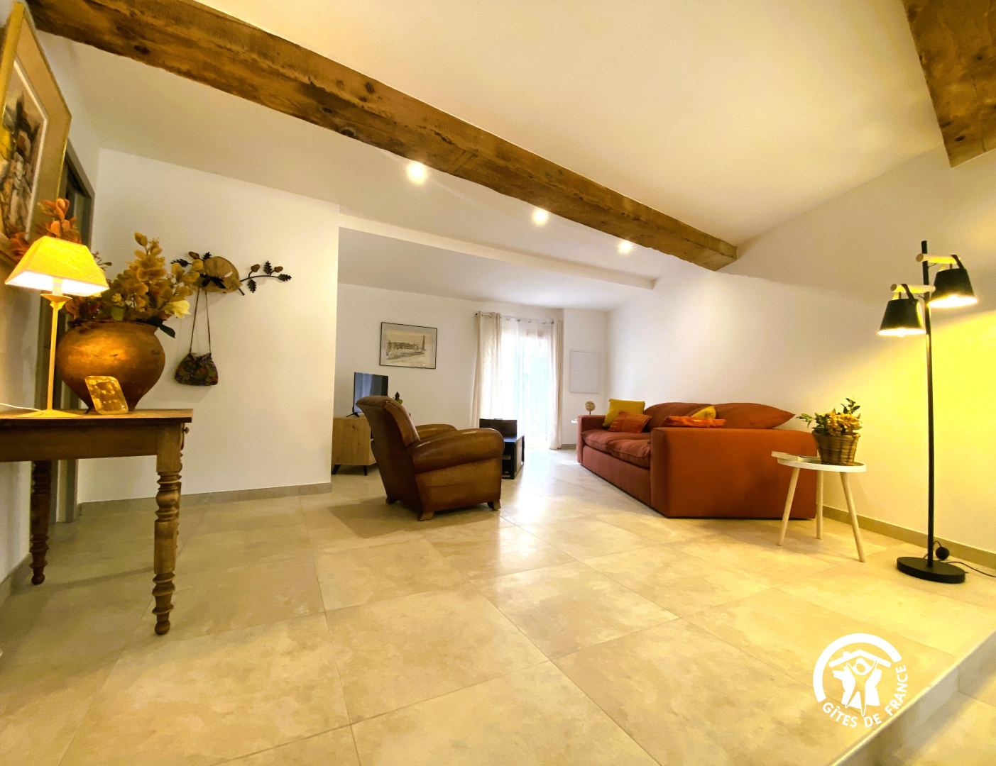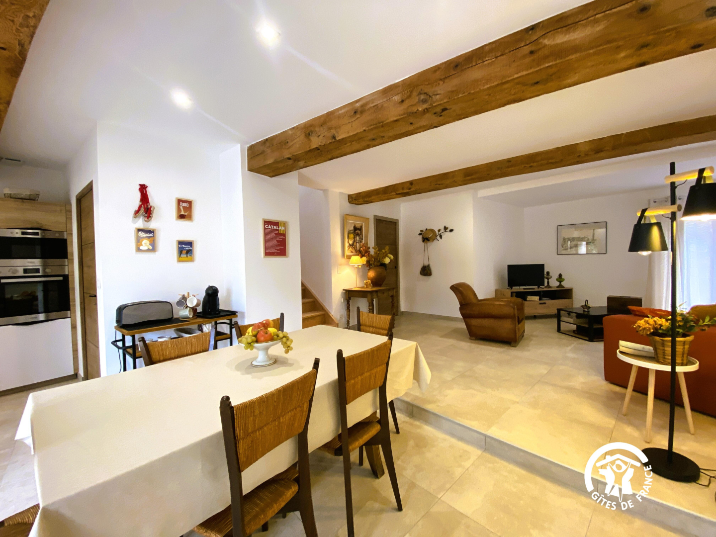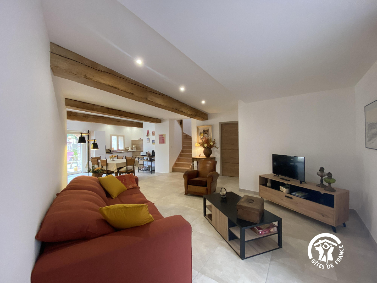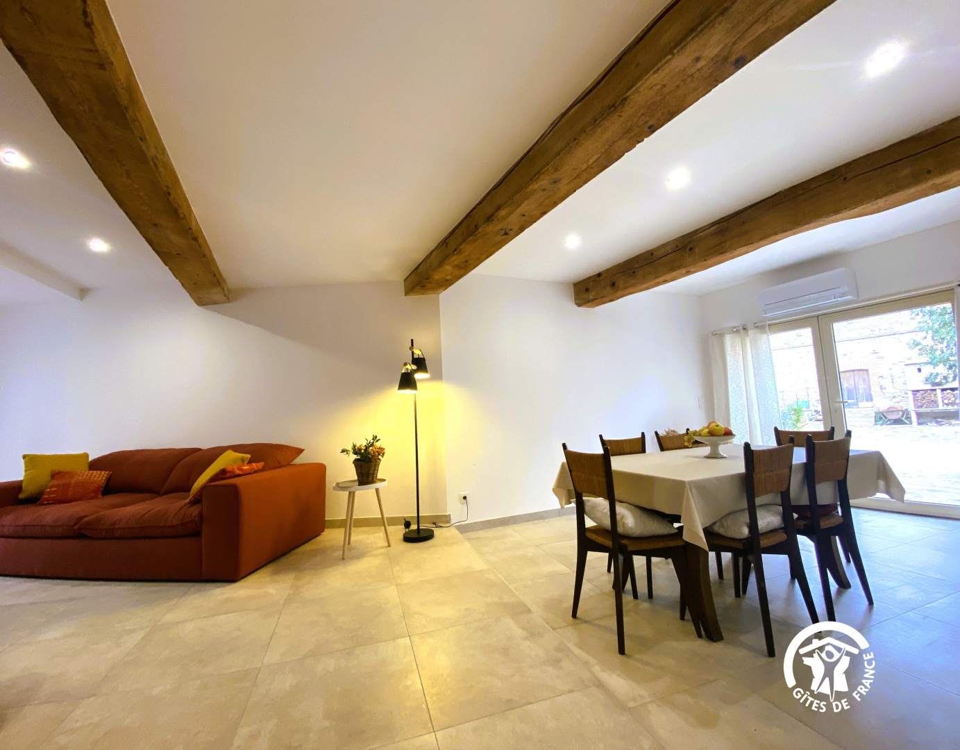 The living room with its kitchen and lounge opens onto a 6 m² private terrace with table and benches.