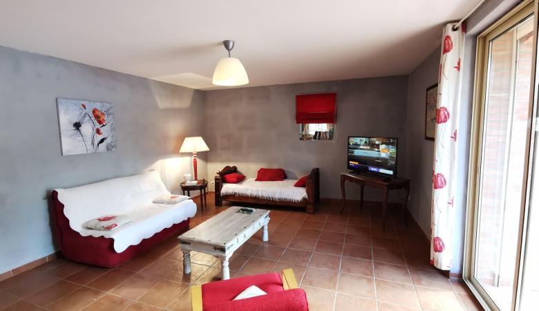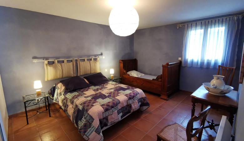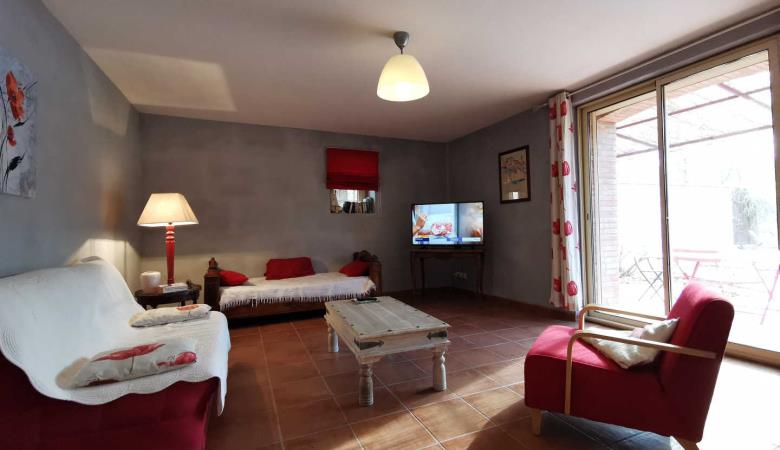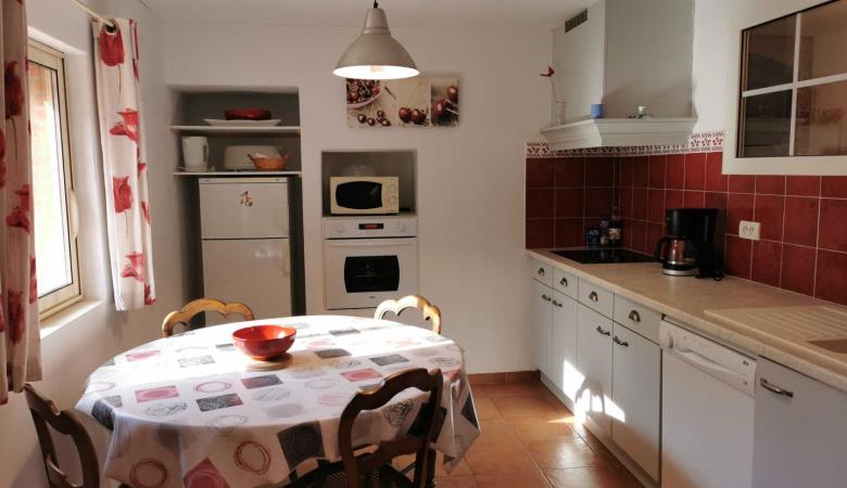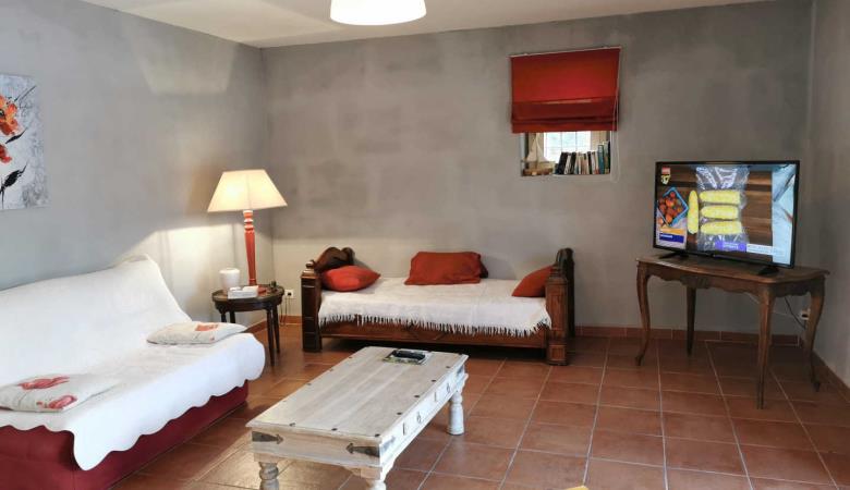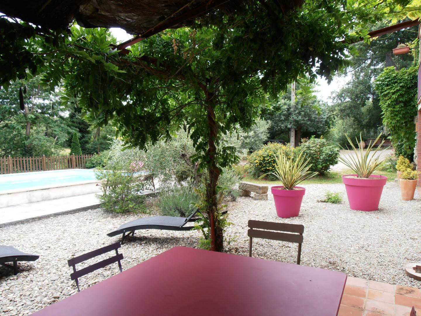 Ground floor with separate entrance: Large living room with kitchen (stone walls and exposed beams, sofa bed for 2 people), 1 bedroom (1 double bed, 1 single bed), shower room, wc. Communal garden with lounge furniture, communal barbecue and access to the owners' private swimming pool (salt water treatment, dimensions: 8 x 4 m. depth 1.5 m., outdoor solar shower). Shaded parking on the property.