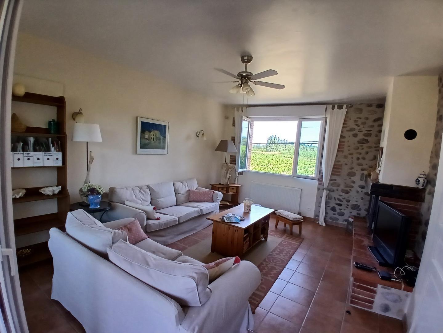 1st level: living room with fireplace and TV, loggia (with office area overlooking the pool)