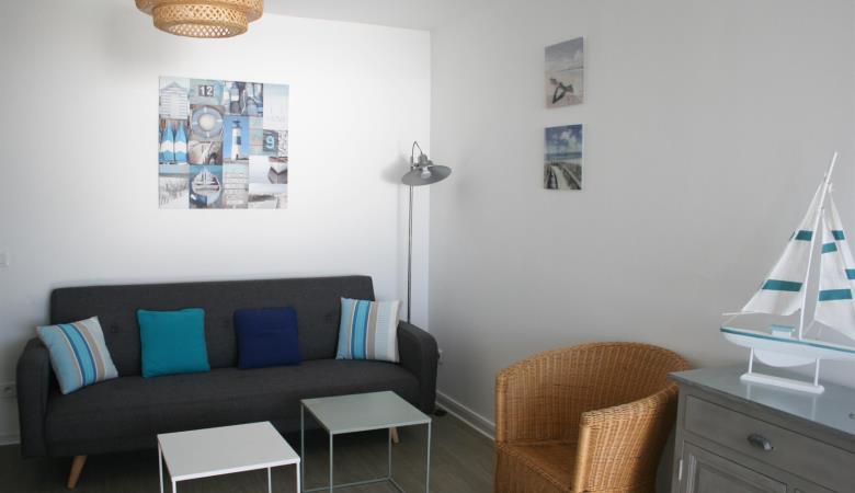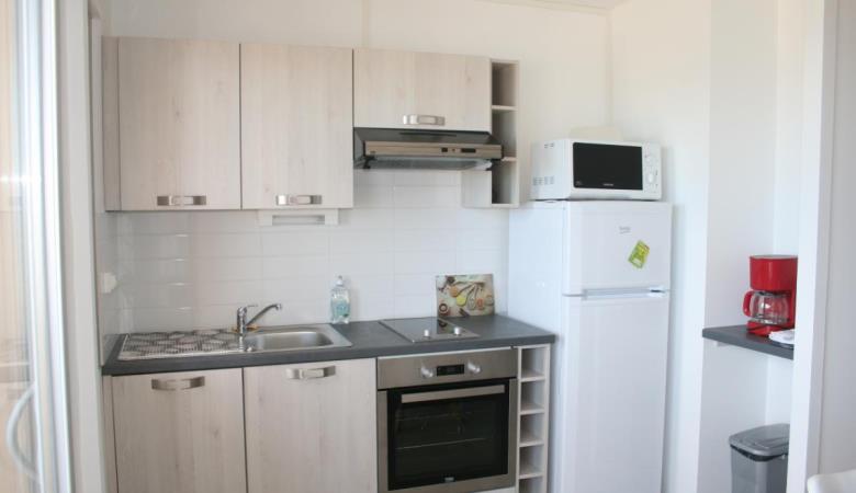 Bright living room with television and fully-equipped kitchen: dishwasher, freezer, microwave, opening onto a small private terrace with garden furniture and views of the Mediterranean.