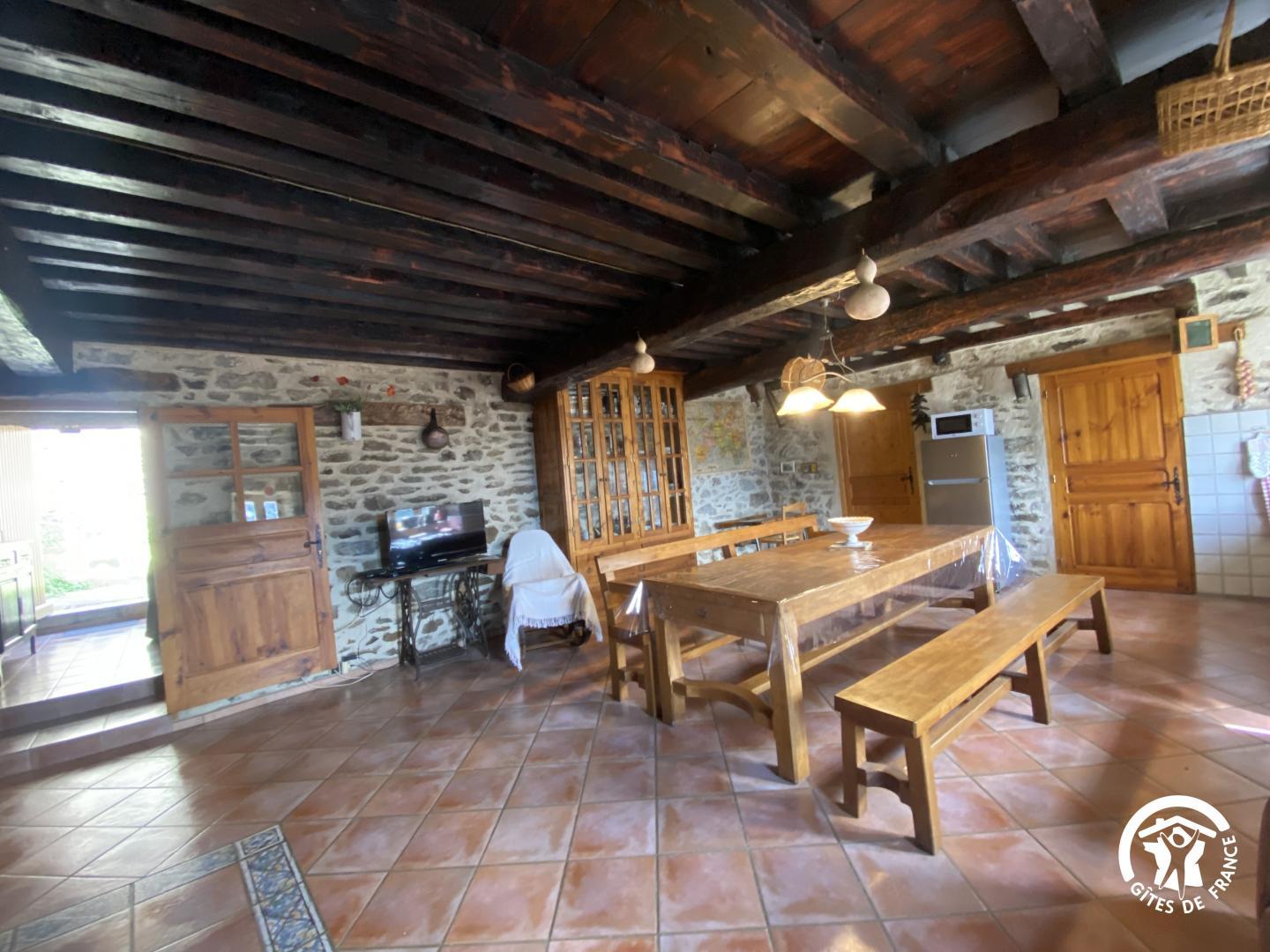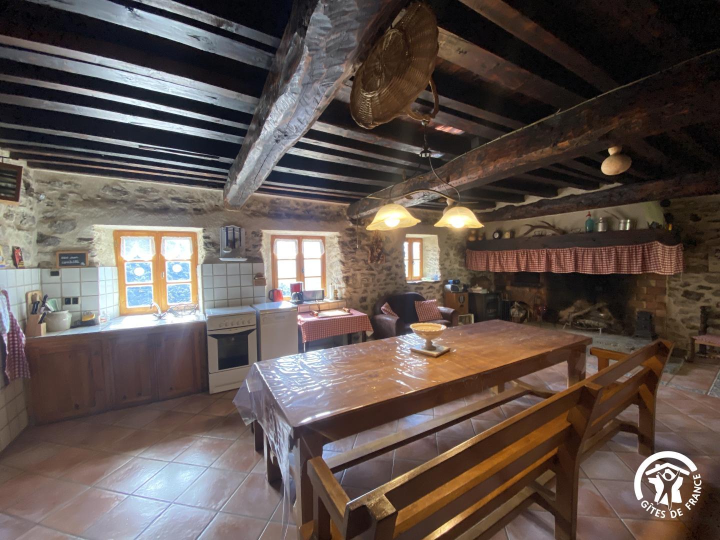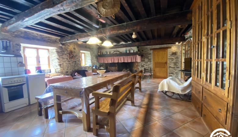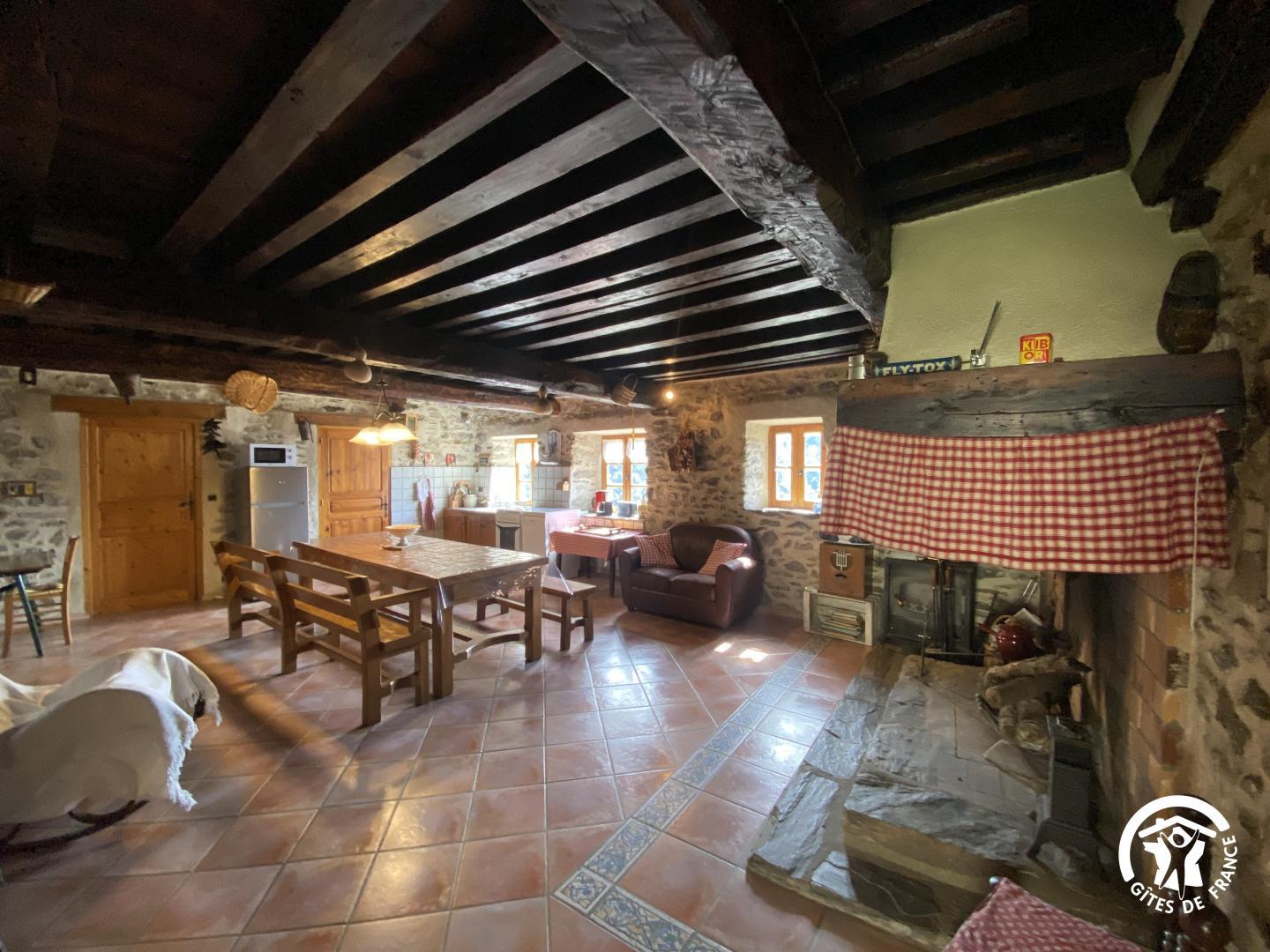 -Living room, kitchen area (large fireplace, stone walls and exposed beams)