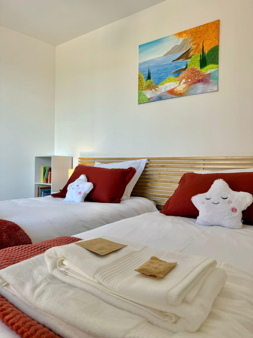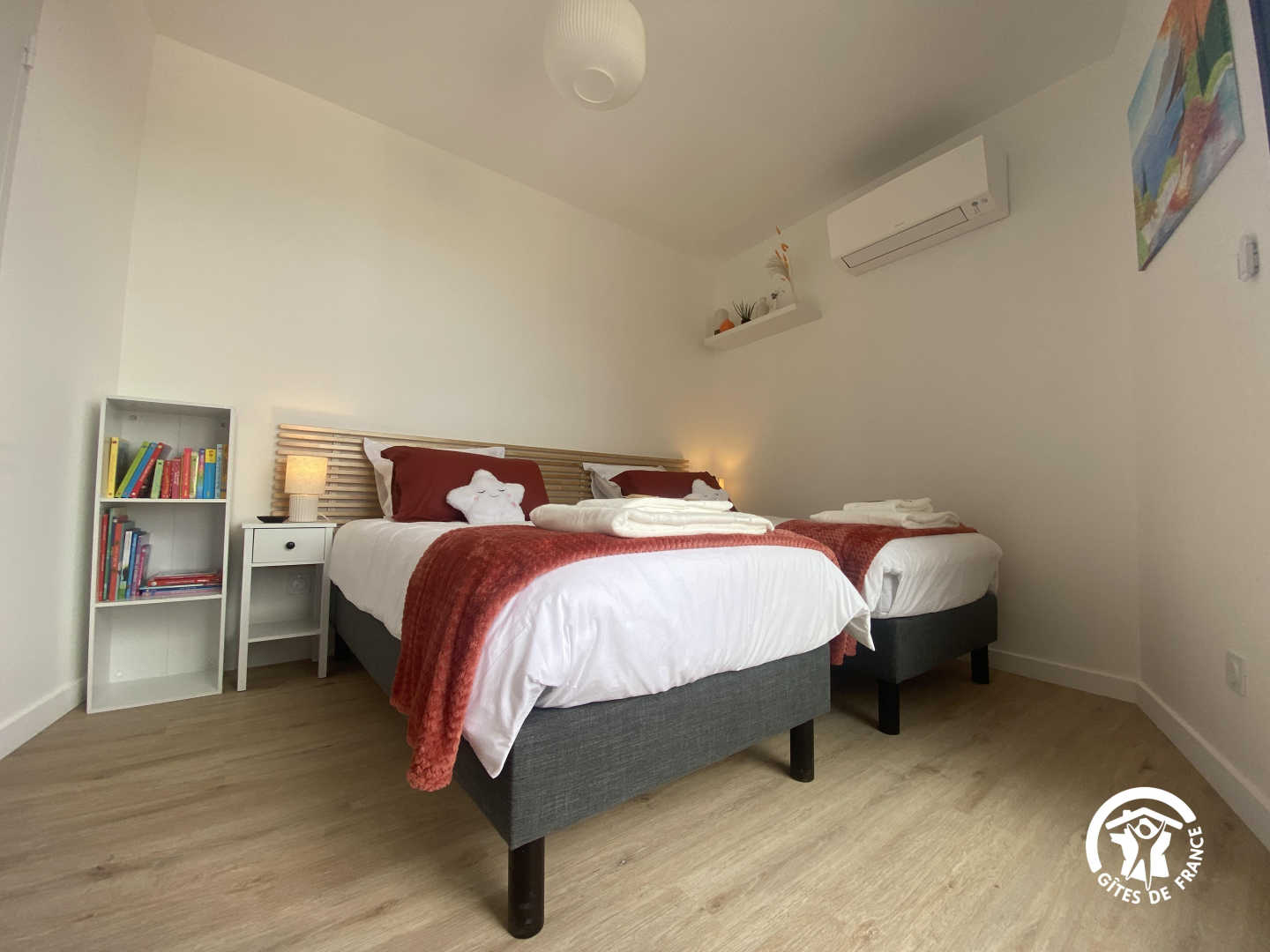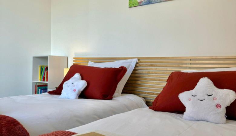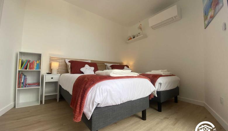 1st level: one bedroom with 2 single beds (possibility of combining them into a single 180cm bed).