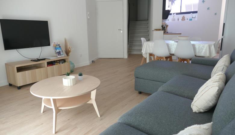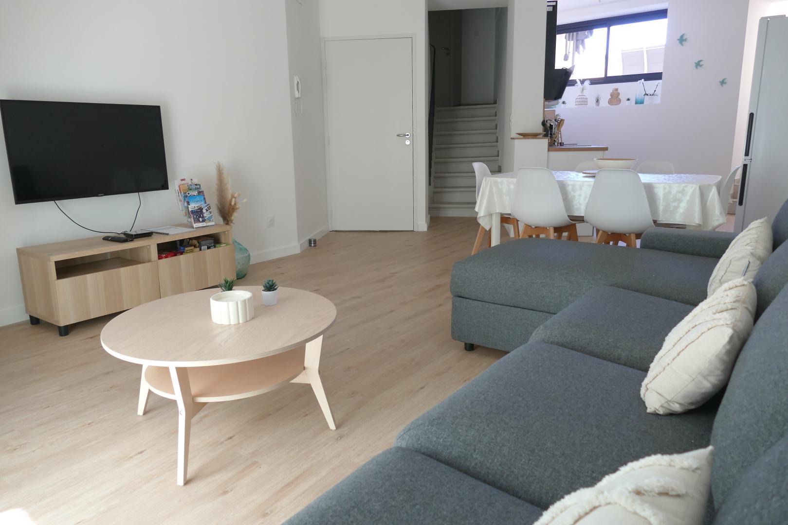 First floor: large living room with dining area, lounge and kitchen opening onto the terrace (accessed via an 8-step internal staircase).